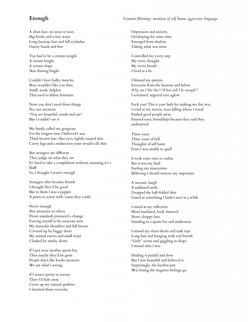 “My piece is a poem about my struggle with body image. Every day, I used to feel terrible, and think horrible thoughts about myself. Throughout my experience, my mental health deteriorated even more. But some part of me knew that it would pass, knew that I would get over it. A sliver of hope helped me get through many of my issues, and I hope it can guide others out of the dark as well.”