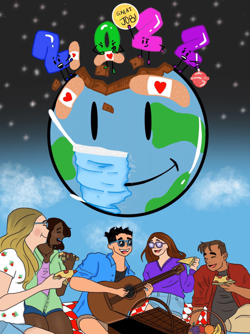 “I drew two friends wearing masks walking toward the finish line and balloons with reminders of last year’s quarantine. They are happy to be together in person.”
