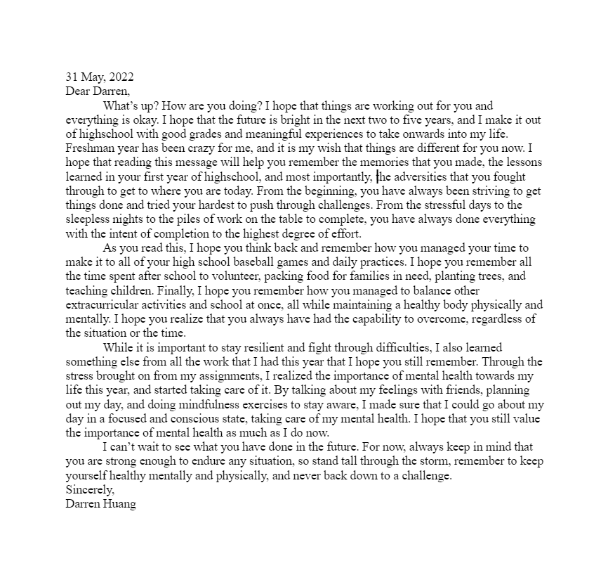 I chose this category because it really connects to me since I can get easily stressed. Writing a letter to my future self really allowed to me understand that there are many different ways on taking care of my mental health. To this day, I still practice the mental health tips to help take care of my mental health.