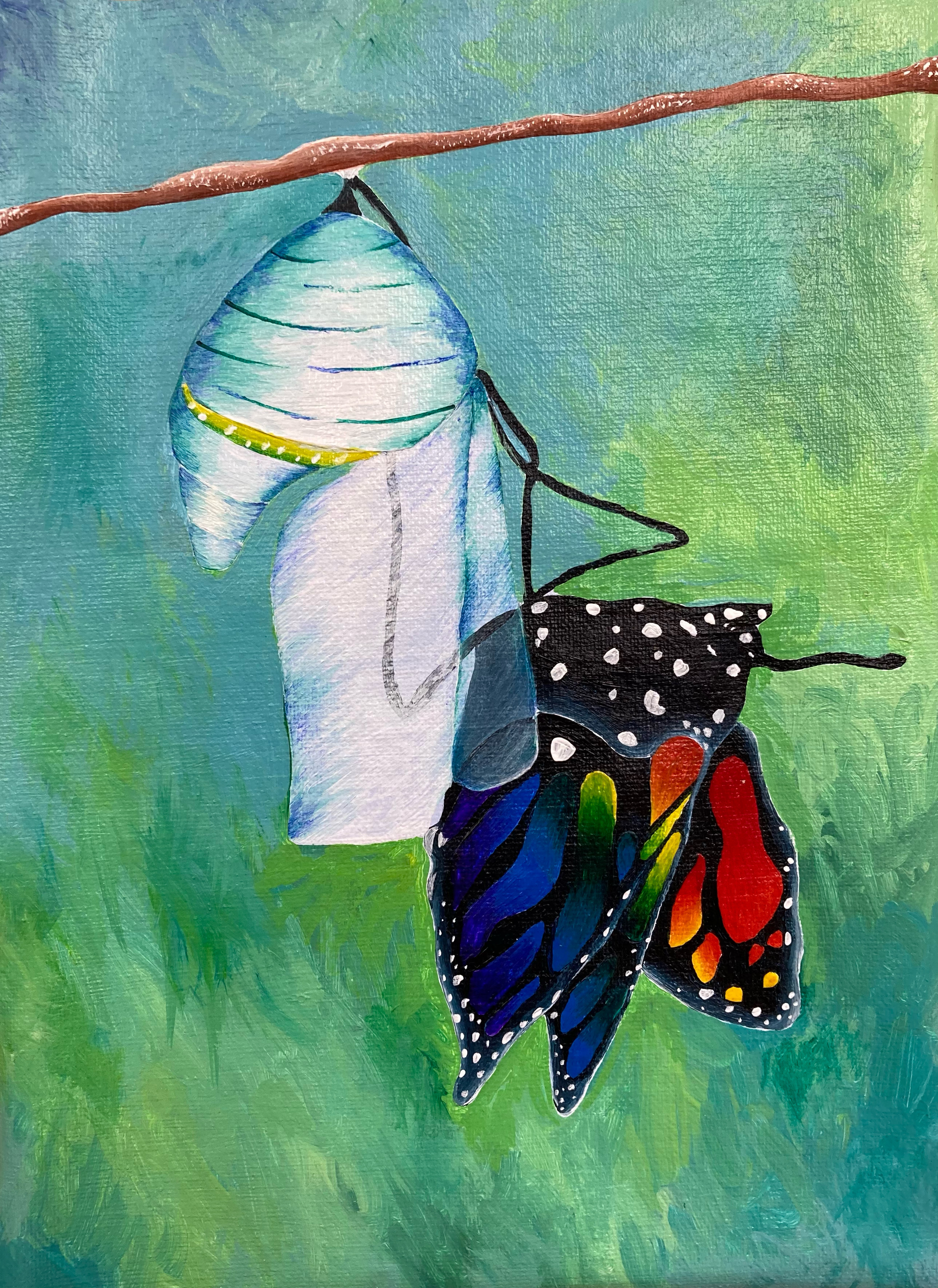 For this project, I used acrylic paint and water to paint a recently hatched butterfly and its chrysalis. The butterfly has a rainbow pattern to represent the rainbow LGBTQ flag. …