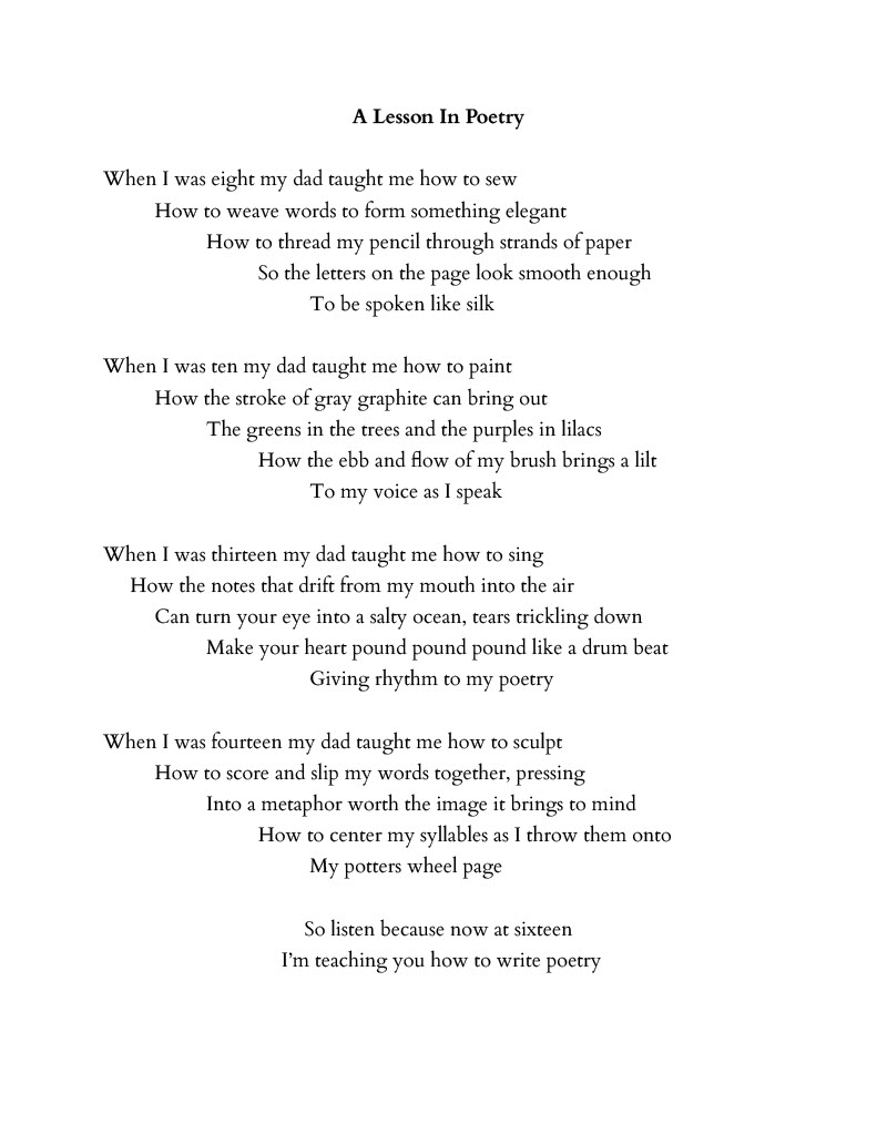 My piece, “A Lesson in Poetry”, is my way of expressing how much poetry means to me. I thought what better way than to discuss this with a poem, one …