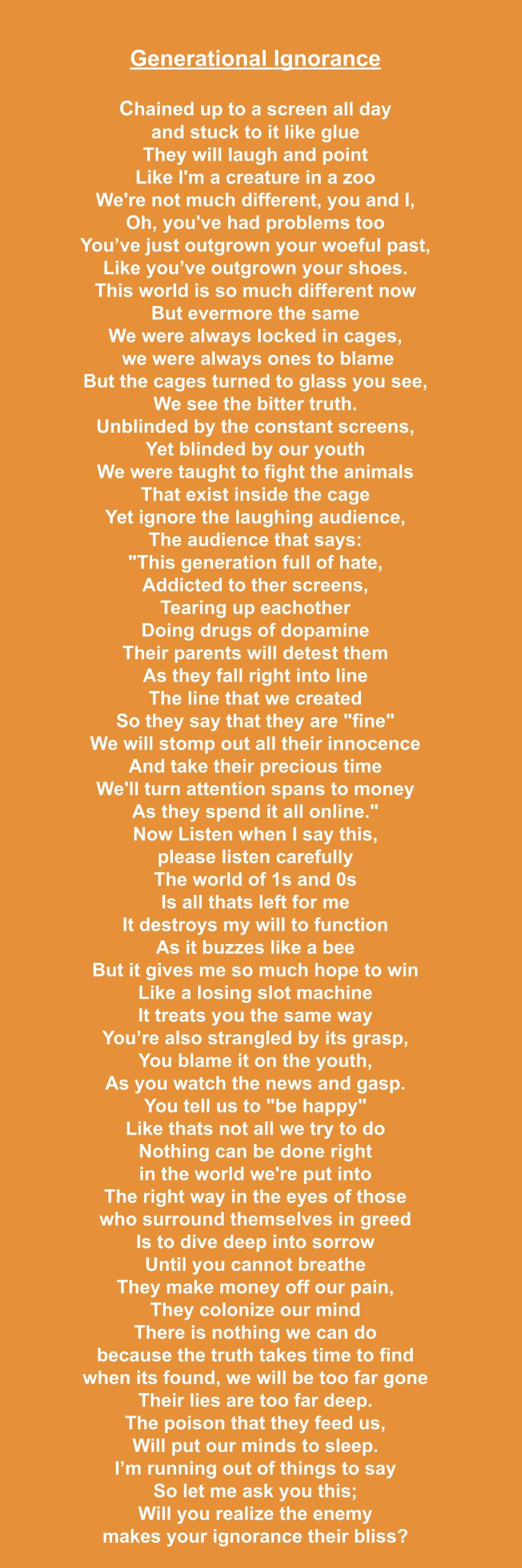 Generational Ignorance tells The story of how Parents of Gen-Z will often disregard their child’s mental health needs due to stereotypes. The Stereotype in question that we are “addicted to …