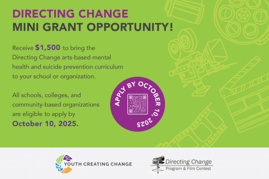 Mini Grant Opportunity! Schools and organizations are invited to apply for Directing Change mini grants this program year. Mini grant teams receive up to $1,500 and commit to creating 5 films for the Directing Change Program, teaching at least one lesson on suicide prevention or mental health, and hosting a student-led event in which their youth films are shared.