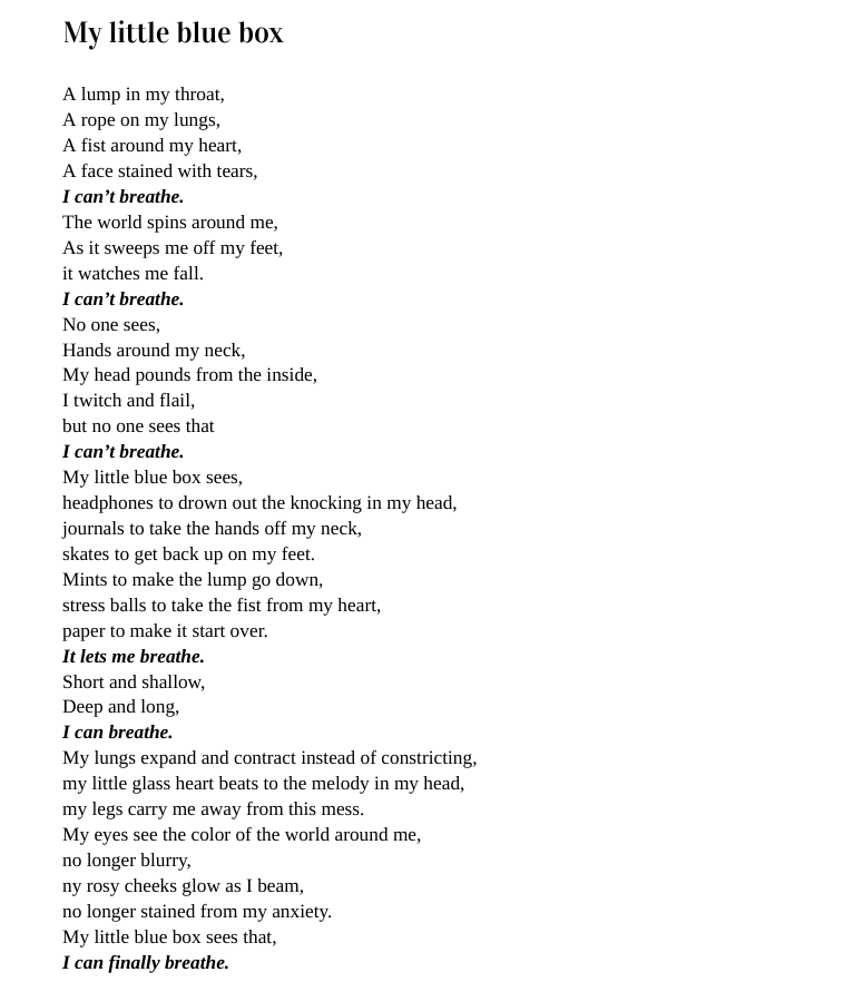 - Second Place Monthly Prompt (Middle School): “My Little Blue Box” by Gurneet Kaur