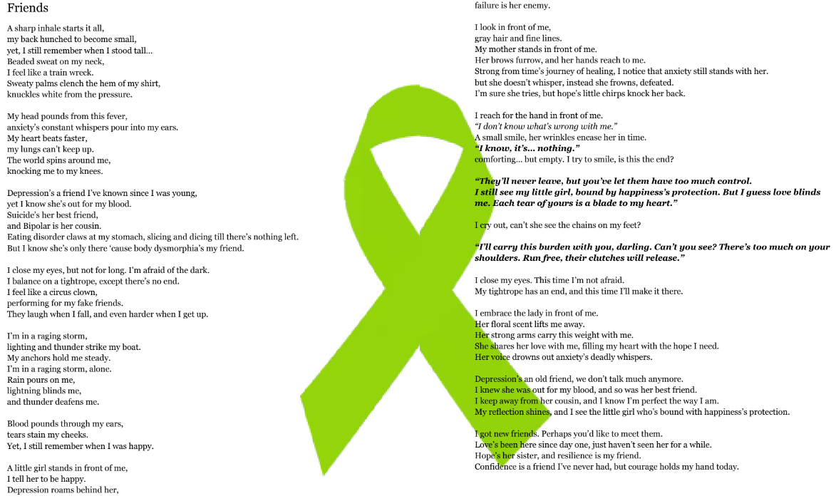 The December/January contest asked youth to create art, films, written works, or audio pieces about how they cope with tough times (Hope), the changes they want to see in their communities (Justice), and what they wish their parents and other adults knew about youth mental health (Monthly Prompt).
