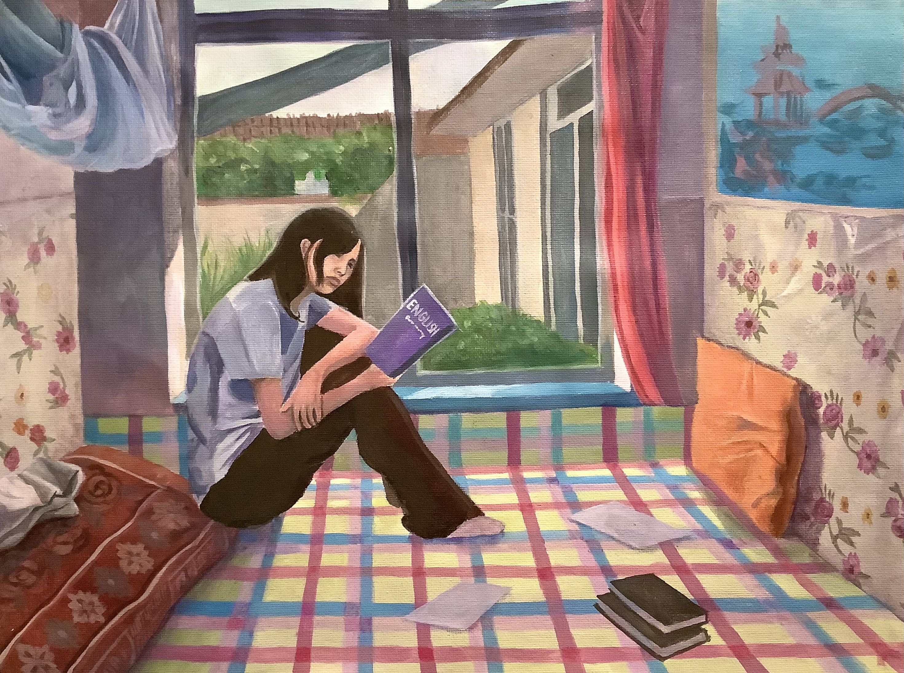 I painted myself enjoying a leisure activity in my grandma’s house back in China. My piece demonstrates my cultural ties and my life experiences in a physical space, all of …