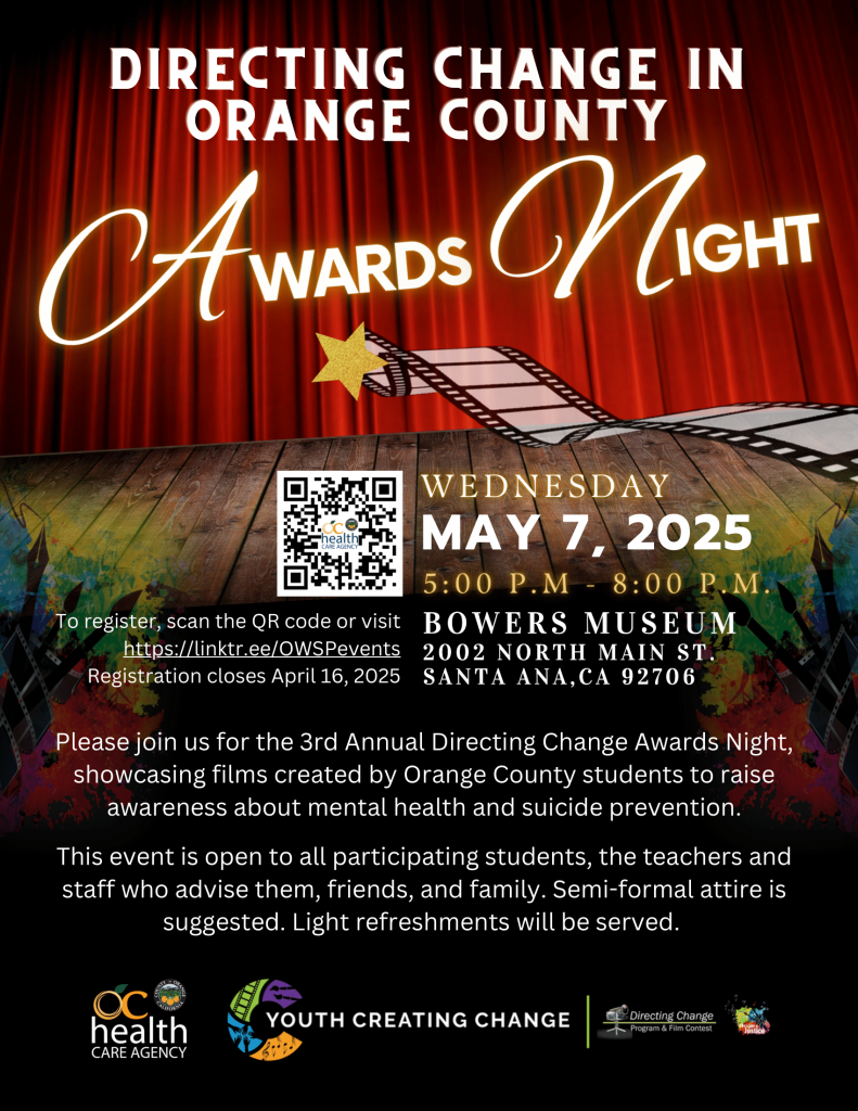 Join Orange County’s 3rd Annual Directing Change Awards Night! The event will share films created by Orange County students to raise awareness about mental health and suicide prevention. Student participants, friends, family, and school staff are welcome to join.