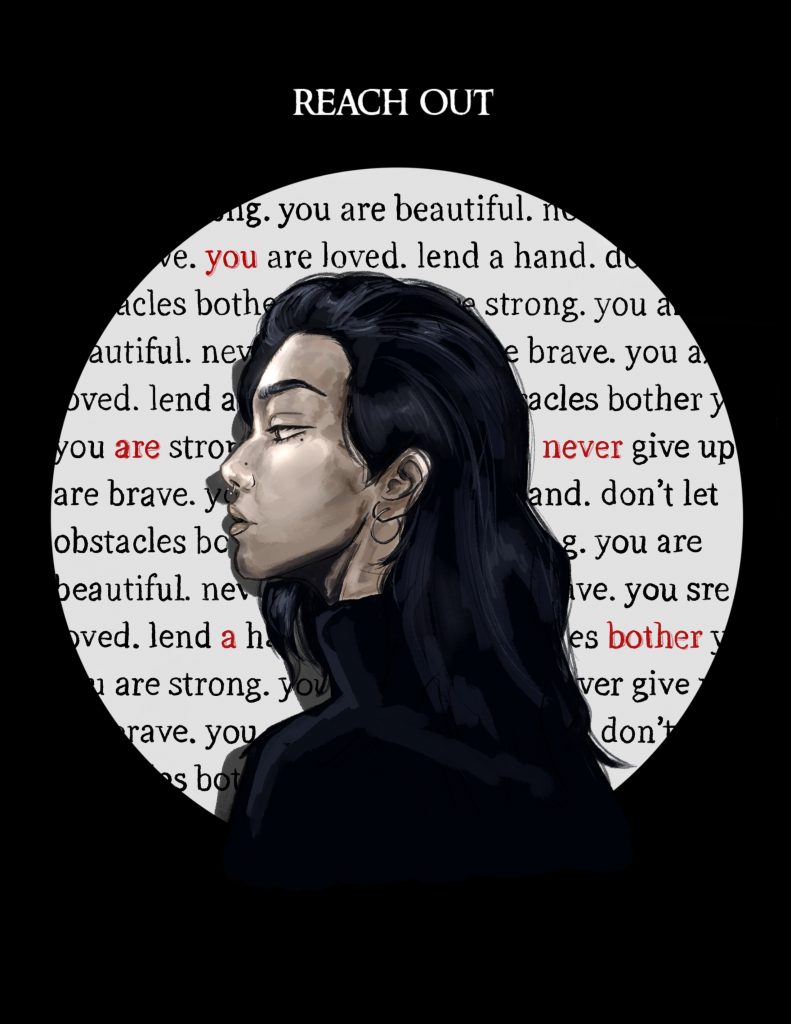 “Truly, we are never alone and there is always one person who is willing to lift us back up. This kind of positivity is all around us, as shown in the drawing with the words surrounding this person. I wanted to show that when people go out of their way to reach out and help you, they are trying to tell you that you are never a bother to them.”