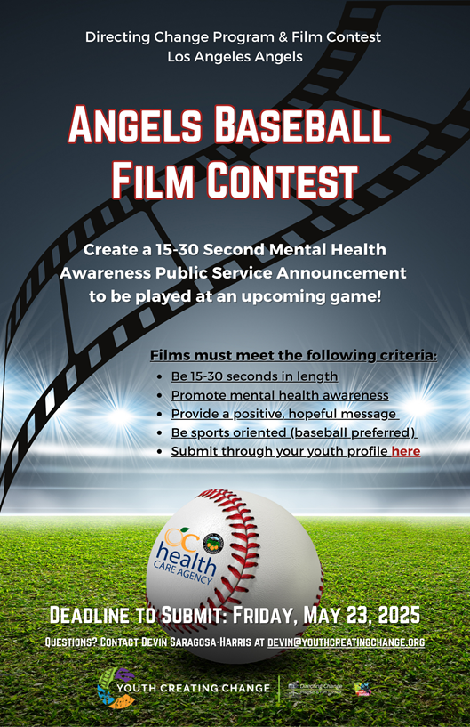 Special opportunity for Orange County youth: In partnership with OC Health Care Agency and Angel’s Baseball, students are invited to create a sports-oriented film that promotes mental health awareness for the Angels to broadcast at an upcoming game!