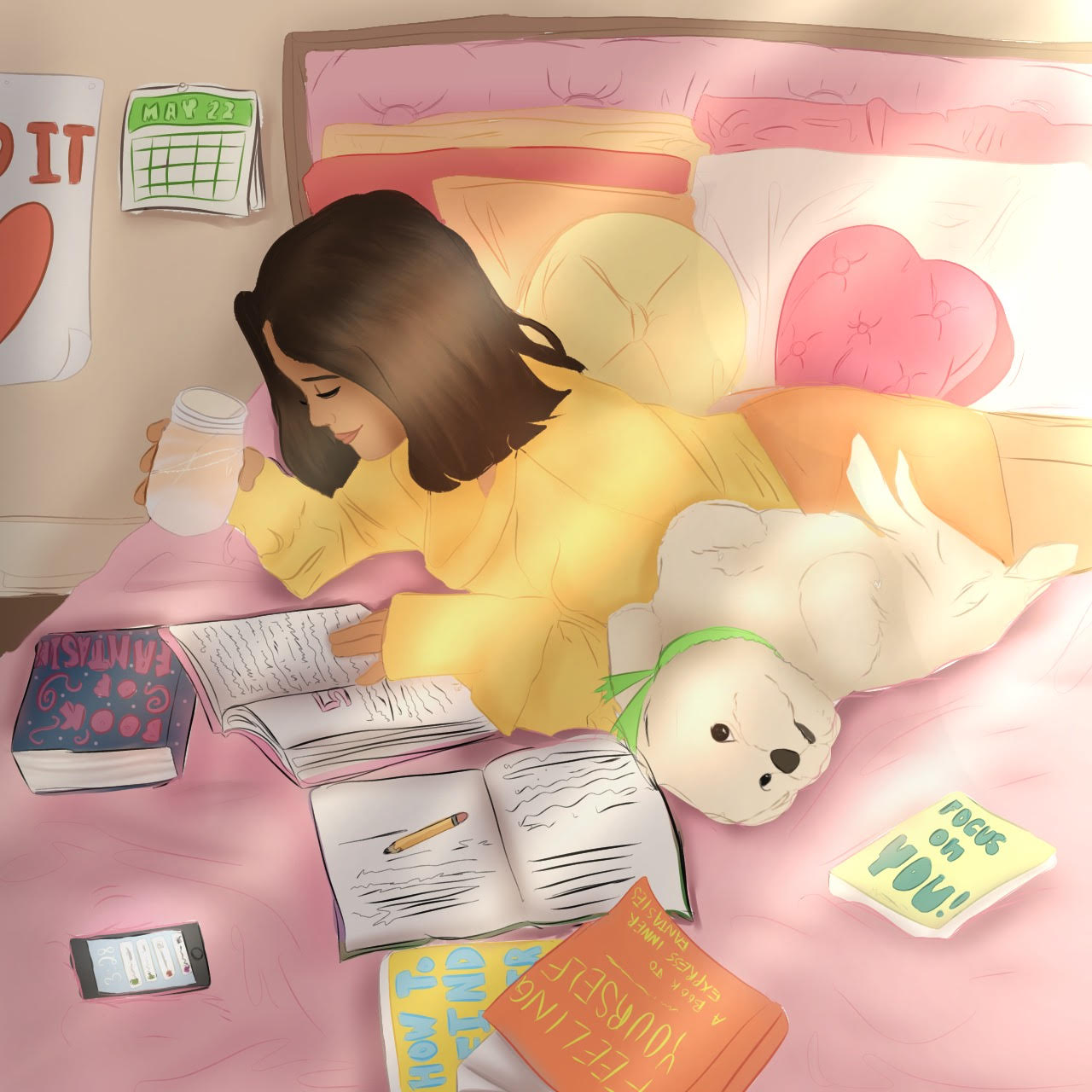 My drawing represents an image of me reading and drinking water which shows how I am taking care of myself to cope with mental health. I have a dog named ...
