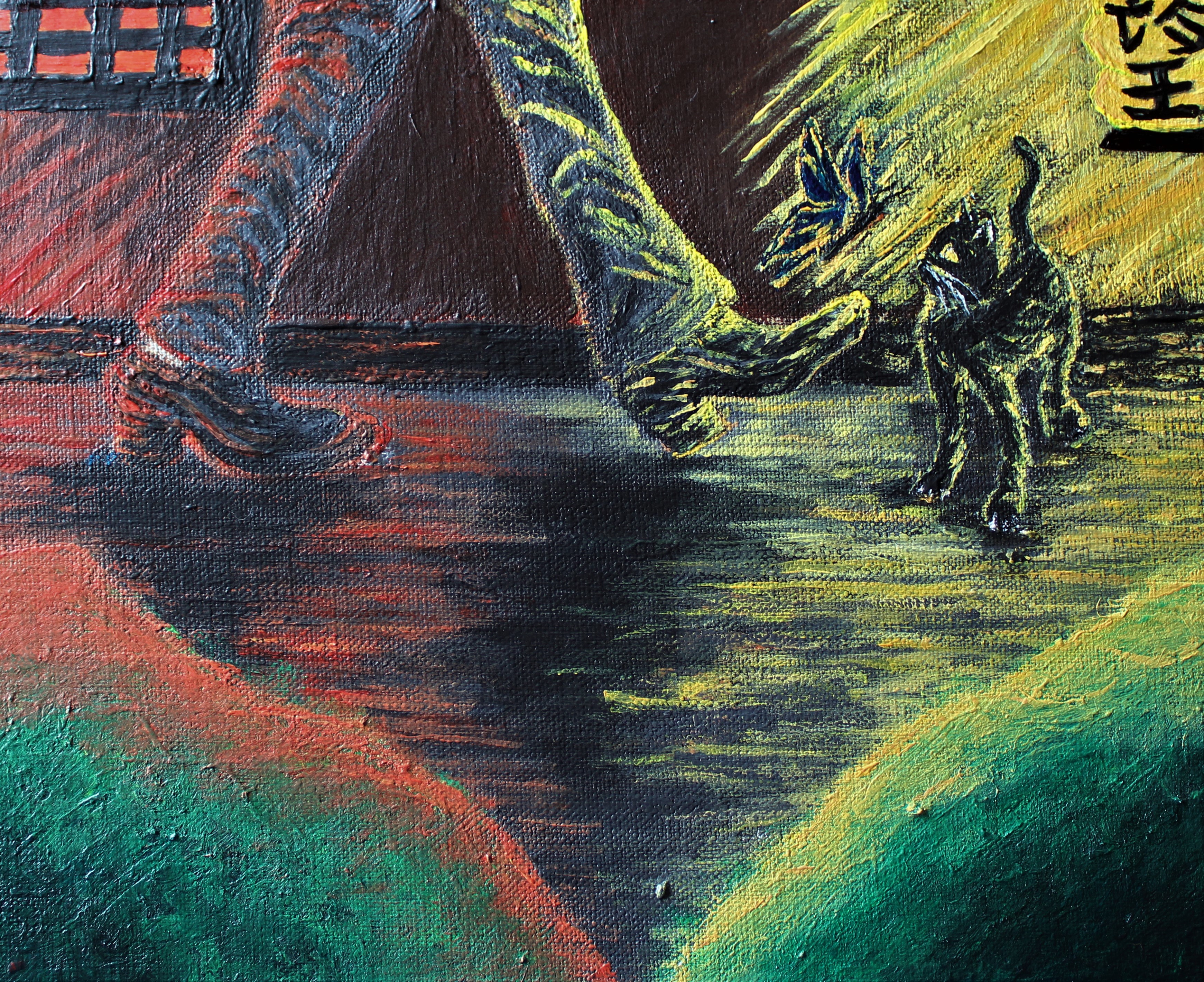 In my artwork, I incorporated the world throughout the vision of a black cat. The people looking out of the art piece are the viewers that can only see half of a man’s body, focusing only on the cat and the butterfly. Since we cannot see much of the man, we look directly at them. I wanted to demonstrate a moment that I have a lof in my life where I just feel tired, or too stressed to focus on the small things of life, which is what the black cat and the butterfly show; they demonstrate the beauty on the small things in life, that sometimes can go unnoticed by others since we tend to stress ourselves by focusing only on the future and on what we need to work on. What makes me get through the rough and stressful times is simply do like the black cat, which is look at the small things that life provides us, and just for a minute stop to appreciate them. This is what gives me hope and power to keep going.