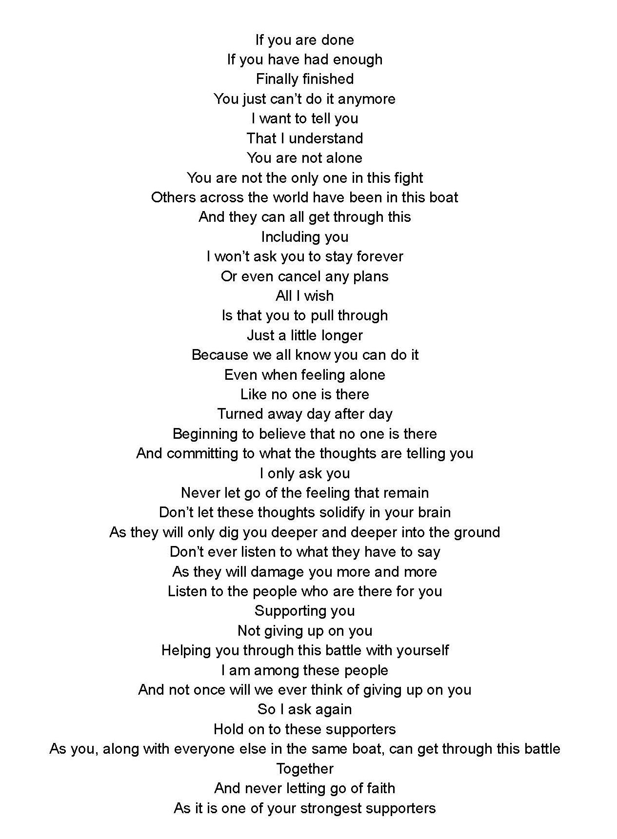 I feel no one really knows how someone may feel or the reason they feel that way. People could be going through the worst and we may never know by them hiding it so well. We have lost many over the years of those who felt like they didn’t matter that felt pain they couldn’t truly define. Many who thought their life didn’t matter who thought they had no one. I wish that through this poster they know that truly they aren’t alone. I myself would say I struggle with telling myself I’m not alone or questioning why I should stay but the poster can be used as a reminder to tell everyone they matter do it for your family loved ones don’t just give up on your battle your truly not alone…