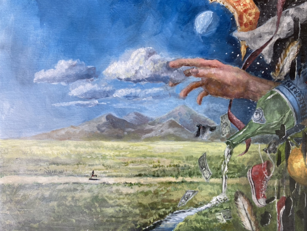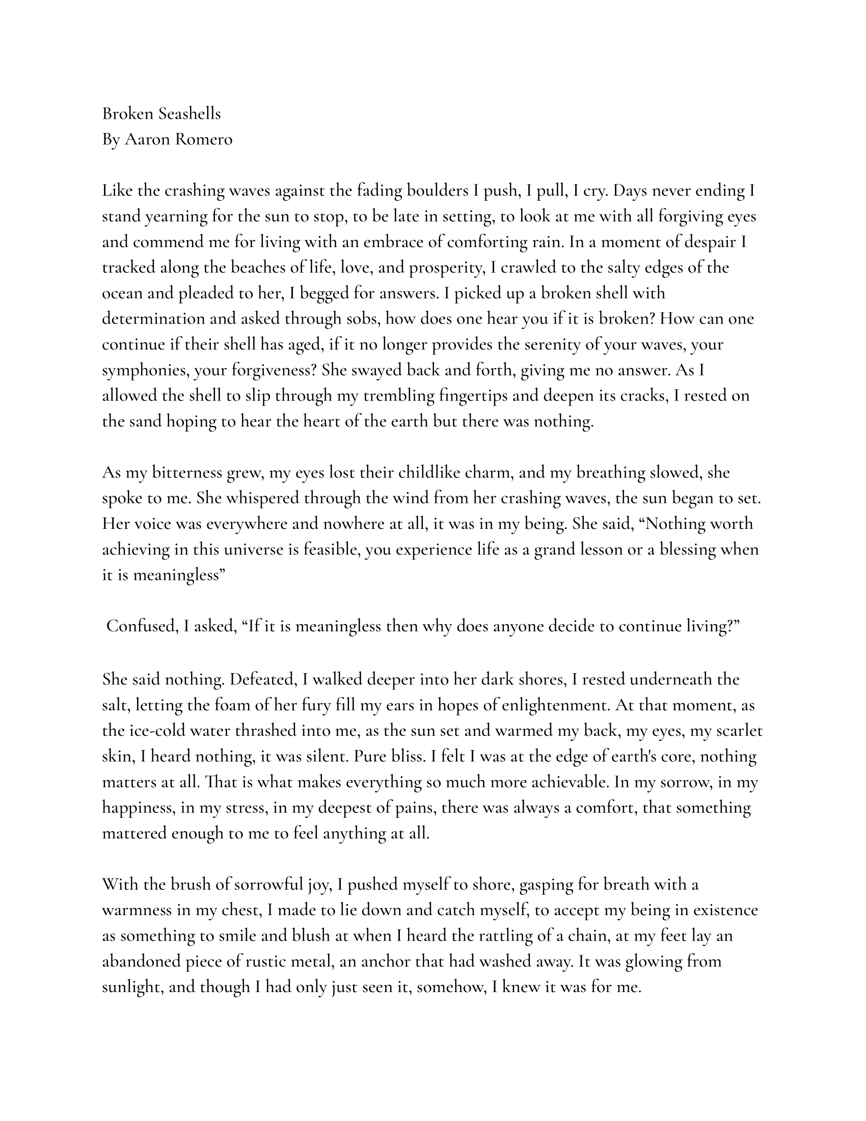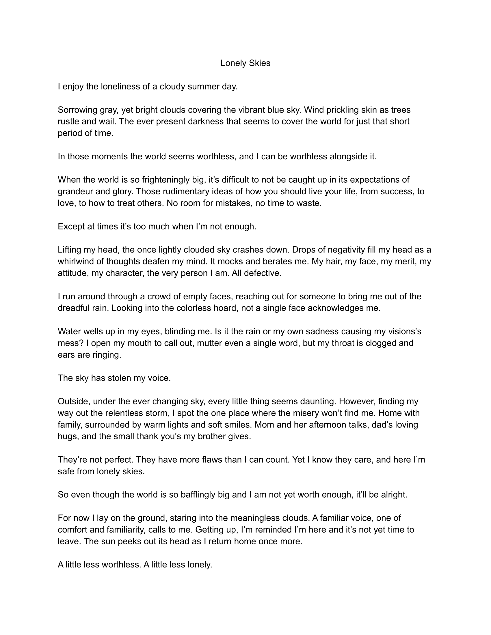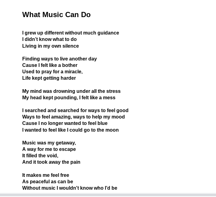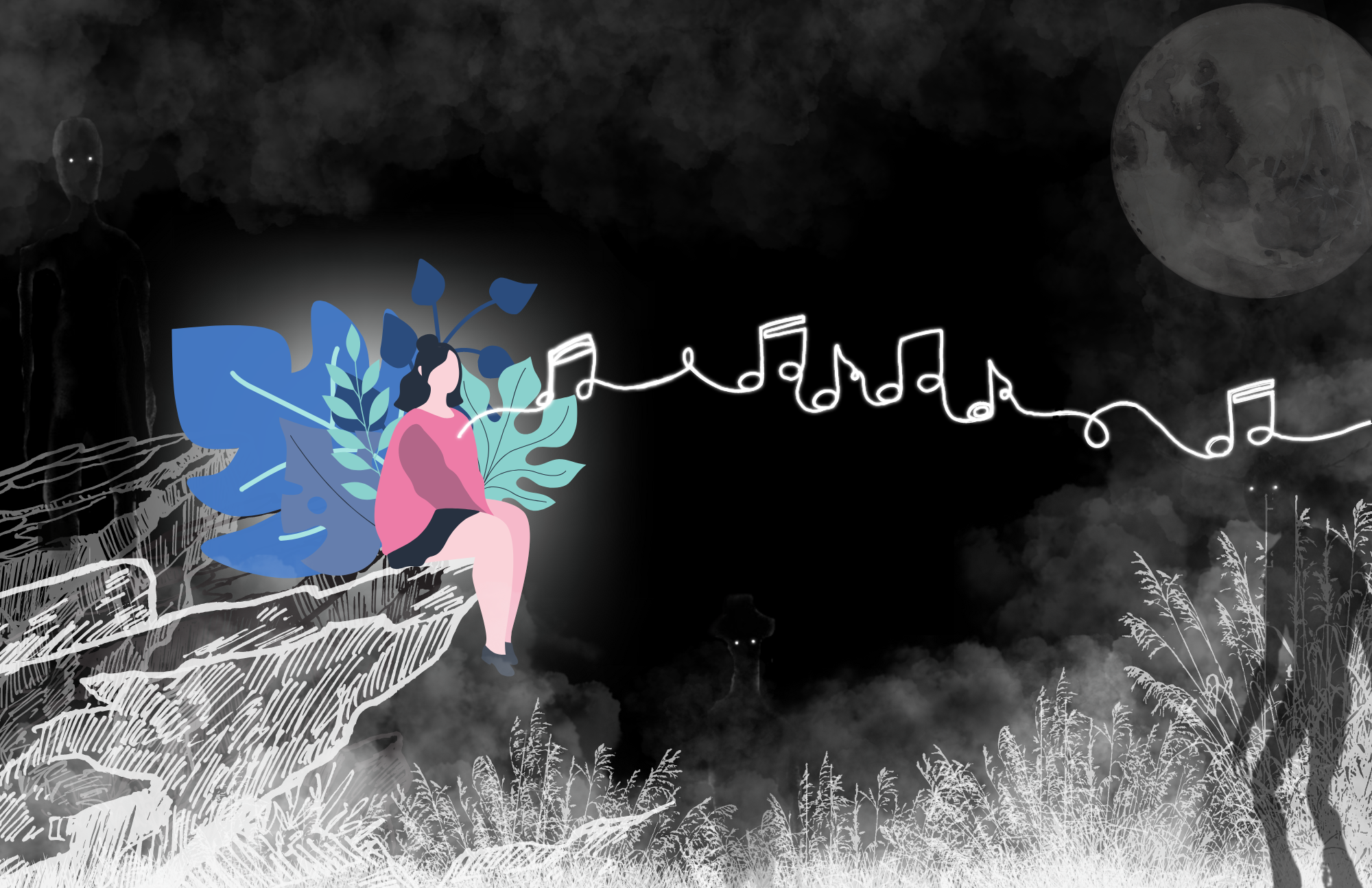 When I saw the “Find your Anchor” monthly prompt, I thought about how much I enjoyed listening to music when I felt down. I thought of the song “Sunday Best” by Surfaces and drew how I felt when listening to that song. I ended up with a sunny background with music notes around my character. In the drawing I am wearing a purple cropped shirt, baggy black pants, a jean jacket, and an off-white pair of shoes. I also have on a pair of red-black spotted earbuds to make it clear that I am listening to music. I chose for my character to be jumping downwards as listening to music is a rush of happiness that is pleasant to me.